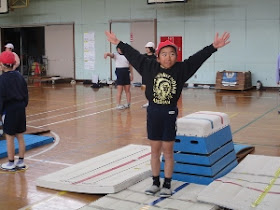 3,4年生は体育でした。今日は跳び箱3時間目で、台上前転をみんなで練習していました。グループごとに互いに出来栄えを見合いながら練習し、手の付く位置や着地の様子などアドバイスし合っていました。片付けも協力してできました。